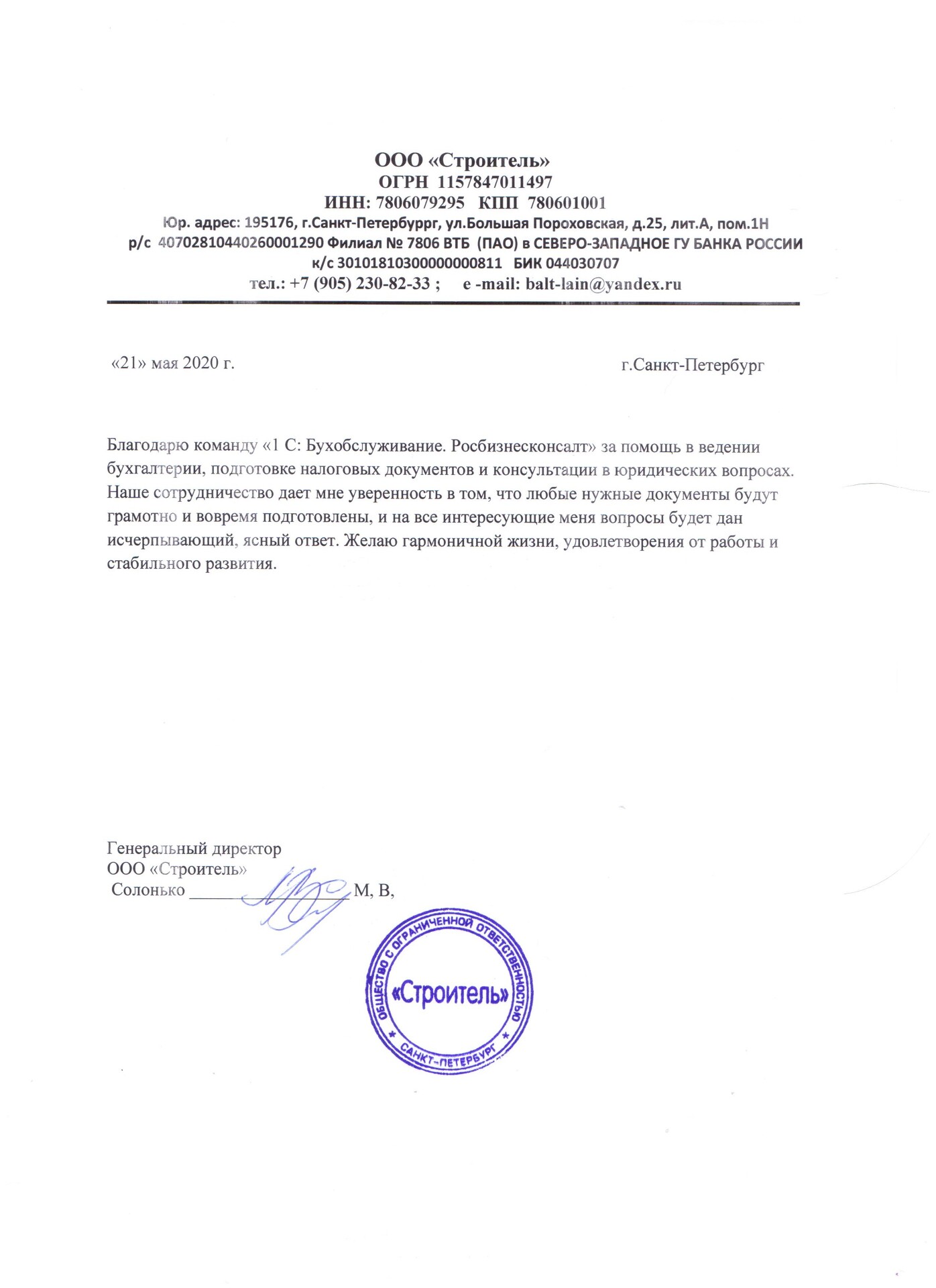 Мы выражаем свою благодарность и признательность за сотрудничество с нами, за проделанную работу в бухгалтерии, составлении отчетности и консультации. Хочется отметить, что облегчили жизнь нашей компании, подключили и настроили ЭДО, теперь всё работает безупречно !