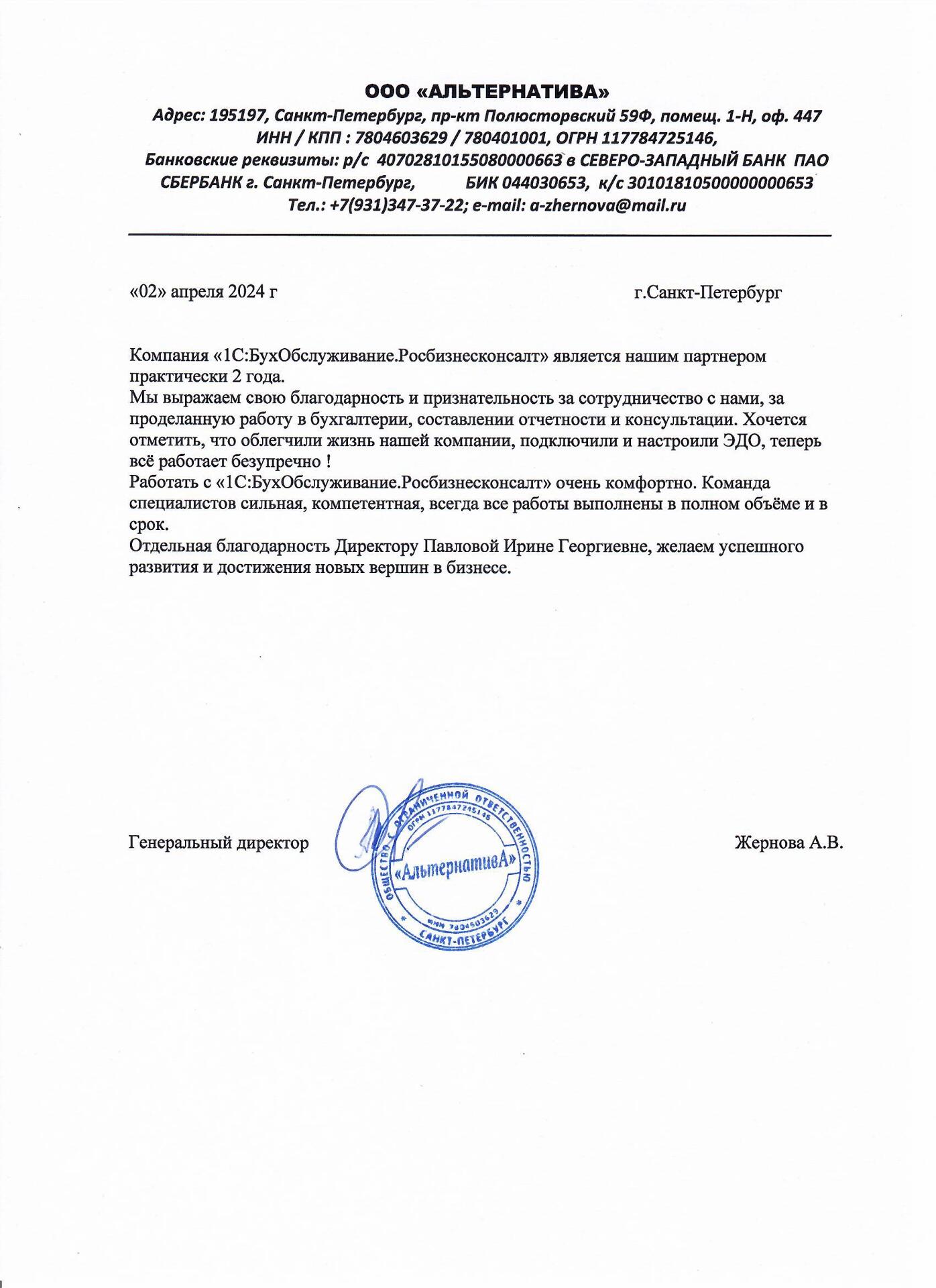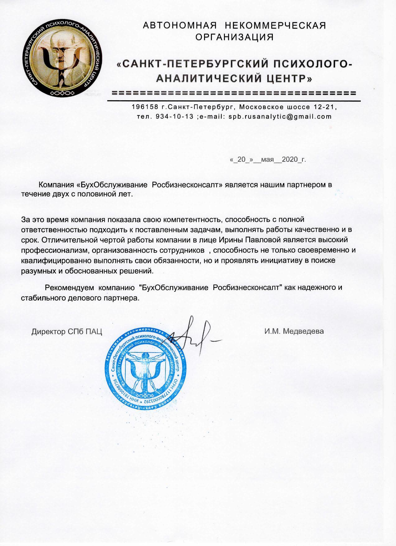 Компания «БухОбслуживание Росбизнесконсалт» является нашим партнером в течение двух с половиной лет.За это время компания показала свою компетентность, способность с полной ответственностью подходить к поставленным задачам, выполнять работы качественно и в срок. Отличительной чертой работы компании в лице Ирины Павловой является высокий профессионализм, организованность сотрудников , способность не только своевременно и квалифицированно выполнять свои обязанности, но и проявлять инициативу в поиске разумных и обоснованных решений.Рекомендуем компанию "БухОбслуживание Росбизнесконсалт" как надежного и стабильного делового партнера.