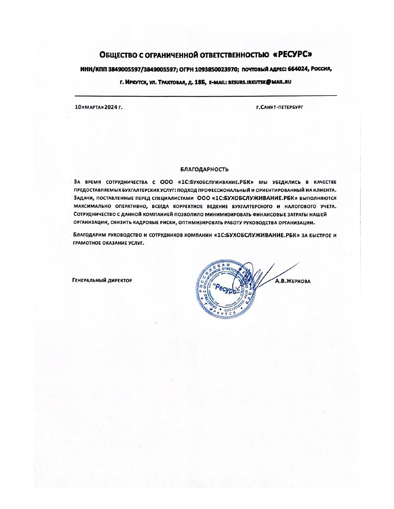 Благодарим руководство и сотрудников компании «1С:БУХОБСЛУЖИВАНИЕ.РБК» за быстрое и грамотное оказание услуг.