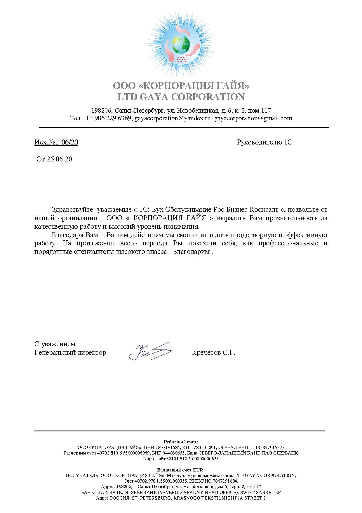 Здравствуйте уважаемые « 1С: Бух Обслуживание Рос Бизнес Коснсалт », позвольте от нашей организации . ООО « КОРПОРАЦИЯ ГАЙЯ » выразить Вам признательность за качественную работу и высокий уровень понимания.